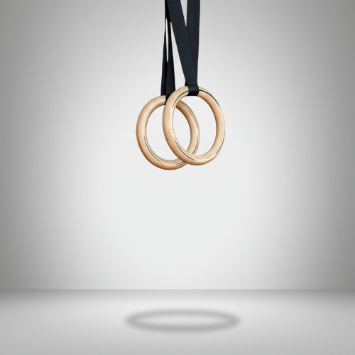 Кольца гимнастические с тросом длиной 2 метра и дополнительной стропой 1 метр, диаметром 23 см, произведённые из многослойной фанеры толщиной 30 мм.