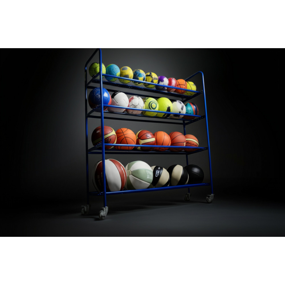 Данная конструкция на колесиках позволяет использовать её как стеллаж для хранения мячей и для их перевозки. Изготавливается для мячей различного диаметра и под разные виды спорта, такие как волейбол, баскетбол футбол и мини-футбол.